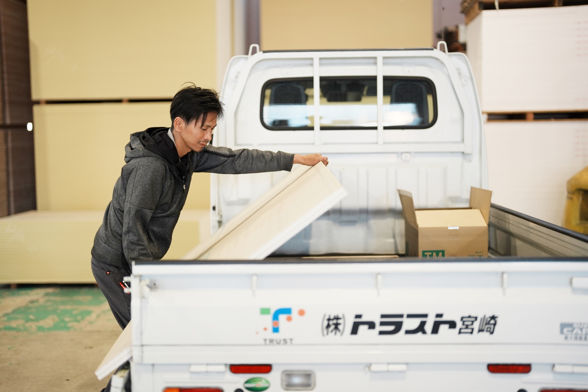 住宅建材・住宅機器やサッシ等の卸売、断熱工事や内装工事、外装工事の請負・施工、太陽光・蓄電池の販売などを行う「株式会社トラスト宮崎」。延岡に本社があり、宮崎・日向に拠点を設けています。トラスト宮崎では住宅を建てるのに必要な材料の提供を行っており、建材やキッチン、サッシなど幅広く取り扱っています。今後さらに事業を展開するため、若手の採用・育成に力を入れています。